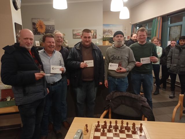 Zweiter wurde Bernhard Pill mit 5,5 Punkten vor Christan Neller mit ebenfalls 5,5 Punkten (auf Grund der Zweitwertung). Das Bernhard vorne mitspielen würde war ja klar. Das Christian als bester Wedeler Spieler den dritten Platz macht mag angesichts seiner kurzen Turnierpraxis überraschen, zeigt aber nur eine tolle Entwicklung. Erst den zweiten Platz in der Vereinmeisterschaft, jetzt den dritten Platz in der Stadtmeisterschaft, ich befürchte nächstes Jahr holt er einen Titel. Wir werden sehen.