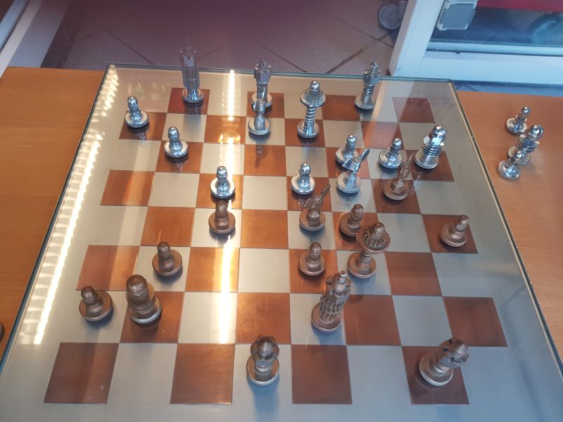 Wir Schachfreunde hatten mal wieder Glück! Zuerst bot uns der Bioladen einen Teil des Schaufensters zur Werbung an. Und dann bekommen wir ein Schachspiel geschenkt, gefertigt aus Schrauben, Muttern, Stahlfedern etc., in wunderbarer Weise zusammengefügt und galvanisiert. Ein sehr schönes Spiel. Das Schachspiel wurde von Peter Tonner (1939 - 2017) geschaffen und uns von der Witwe zur Verfügung gestellt. Hier ein Gesamtbild: